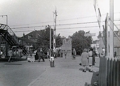 De overweg aan de Spuiweg naar het noorden gezien. Links …