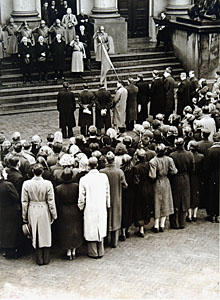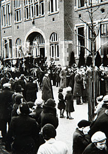 H.B.S.'ers zingen het Wilhelmus voor het stadhuis bij de …