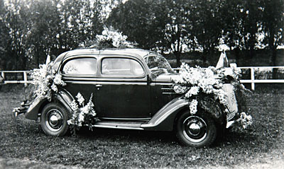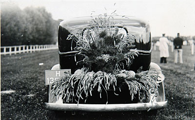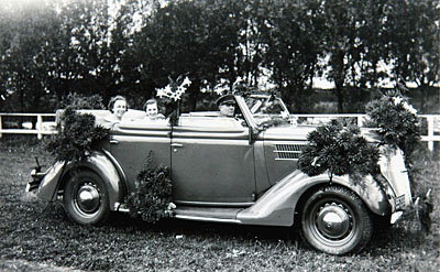 Deelnemende auto aan het bloemencorso op Oranjedag.