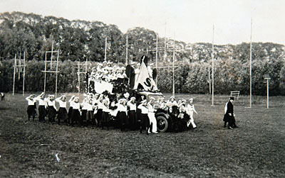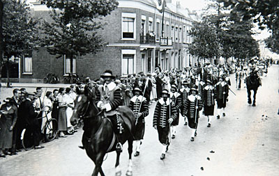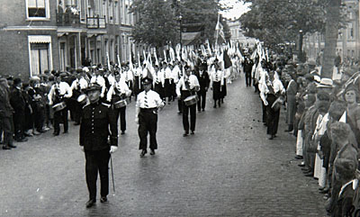 Dordrechtsch Fanfarekorps in de optocht op Oranjedag.