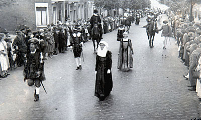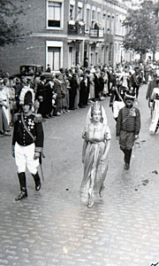 Deelnemers in de optocht op Oranjedag.