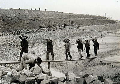 Werkers sjouwen brokken steen voor de beschoeiing van de …