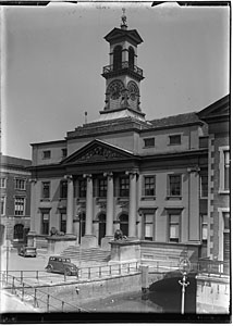 Geparkeerde auto's op het Stadhuisplein, gezien vanaf de …