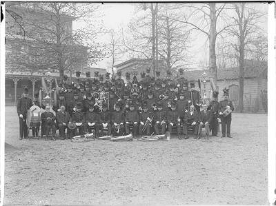Dordrechts Fanfare Korps in de tuin voor een schouwburg