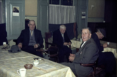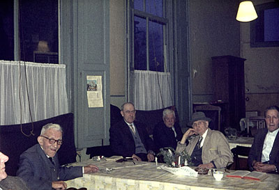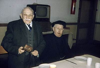 Bewoners van het oudemannenhuis in de tuin van het gebouw …