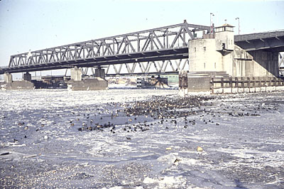 De verkeersbrug en daarachter de spoorbrug over de Oude …