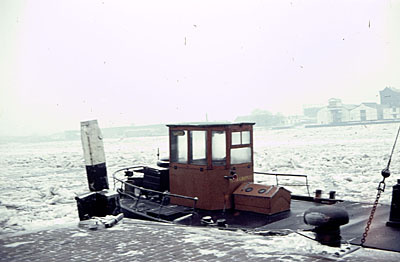 Bevroren Oude Maas, gezien vanaf de hoek Hooikade/Bomhaven.