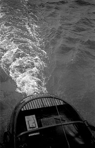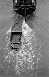 Roeiboot achter rijnaak.