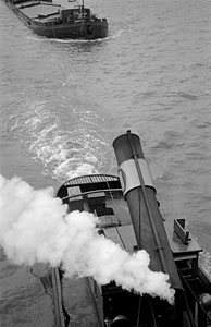 Sleepboot met neergelaten schoorsteen sleept een rijnaak.