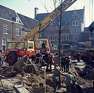 Het plaatsen van de nieuwe bomen op het Hof.