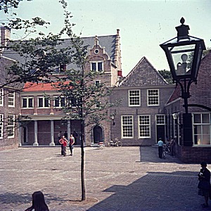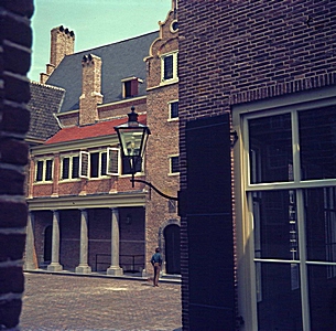Zicht op de hoofdingang van het Hof, met de zuilengalerij …