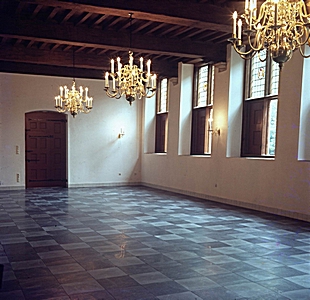 De gerestaureerde Statenzaal met de kroonluchters.