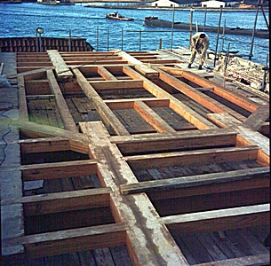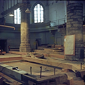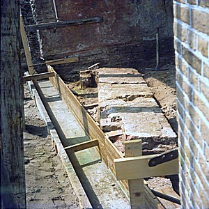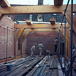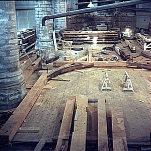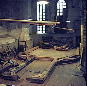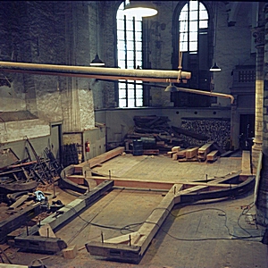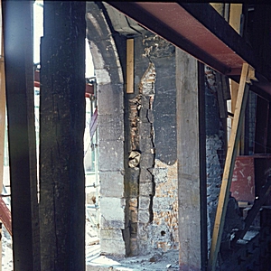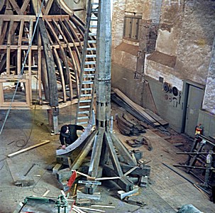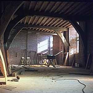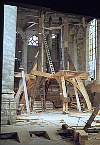 Zicht op de balken tijdens de restauratie van de …