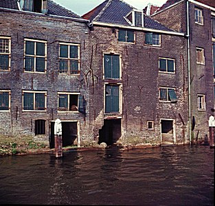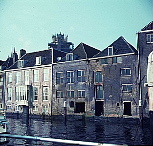 Bouwvallige pakhuizen (watergevels) de achterkant van de …
