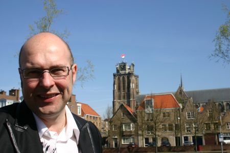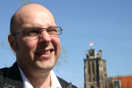 Wethouder Hans Spigt, op de achtergrond de Grote Kerk