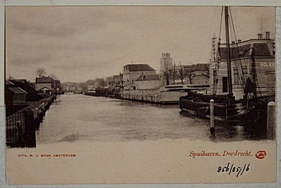 - Spuihaven gezien vanaf de Johan de Wittbrug naar het westen; rechts het badhuis aan de Vest