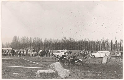 - Motorrace op een grasparcours in het Sportpark Reeweg; de kluiten vliegen de toeschouwers om de oren.