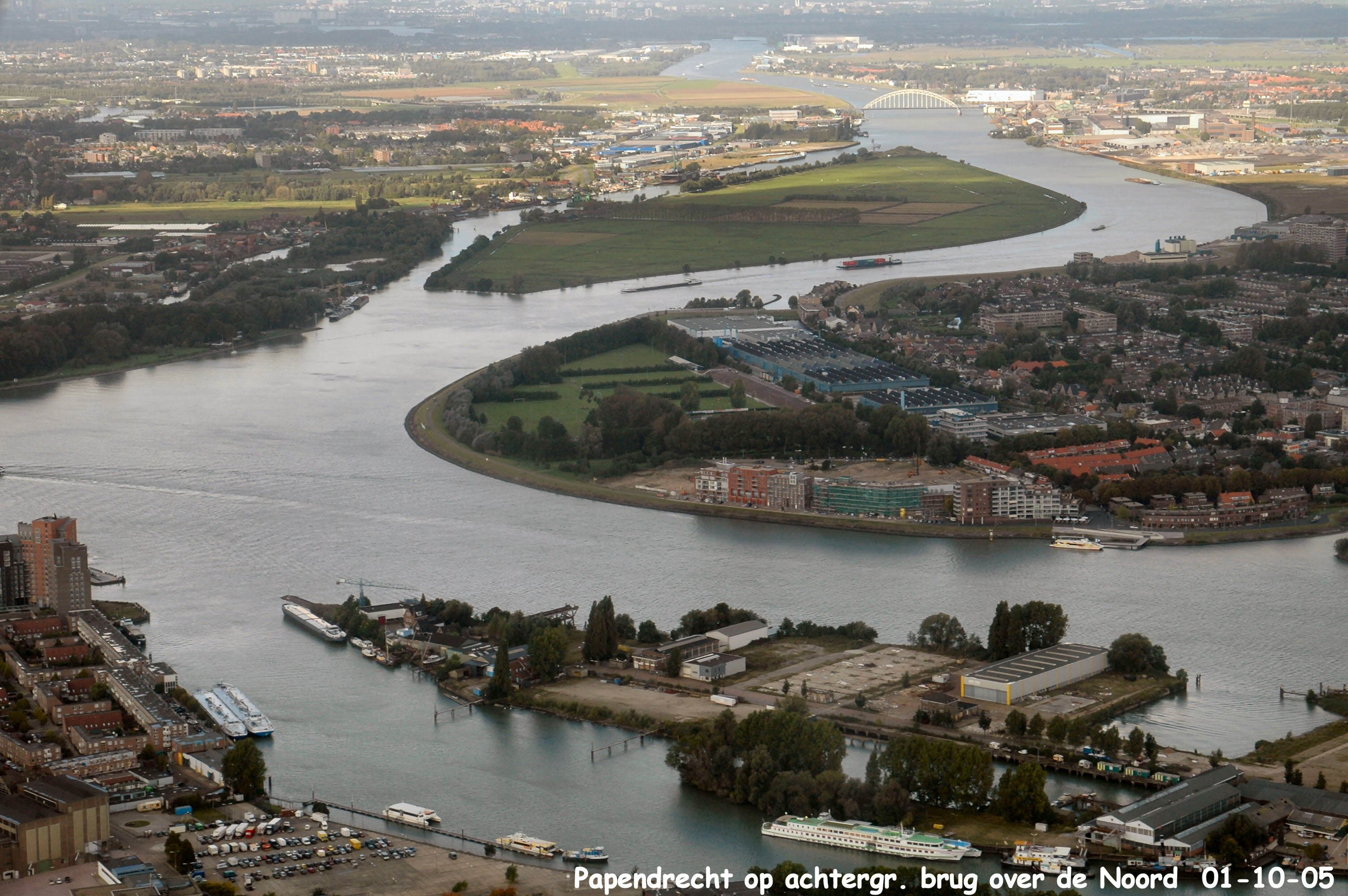 Links onder is de Lijnbaan met het Wantij en Stadswerven er boven. Midden rechts Slobbegors in Papendrecht . Links boven |H.I.Ambacht met de brug over de Noord rechts boven gezien in Noordelijke richting.