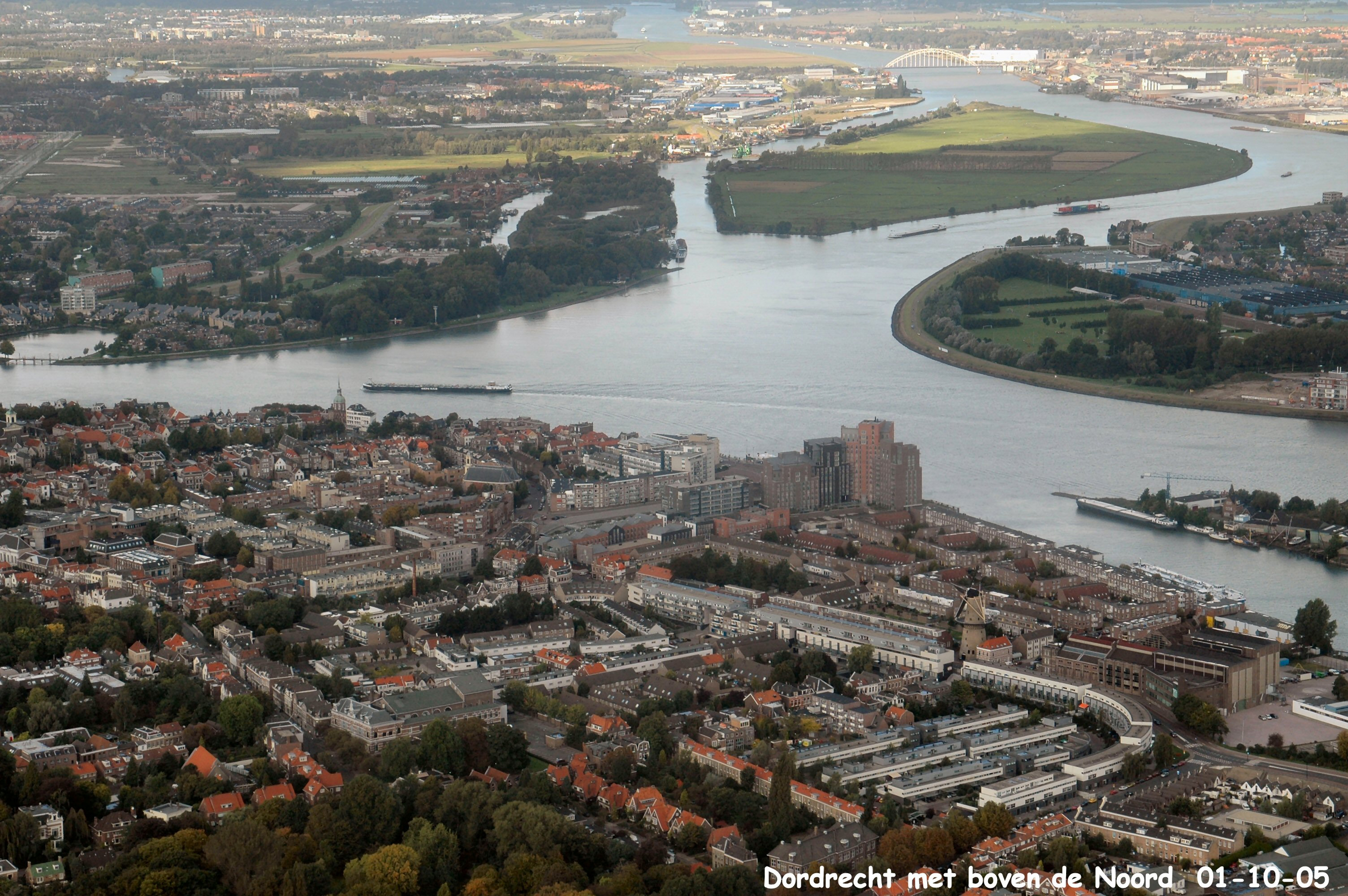 Onder is Dordrecht met links boven Zwijndrecht en rechts boven De Noord met Alblasserdam. Midden rechts is Papendrecht gezien in Noordelijke richting.