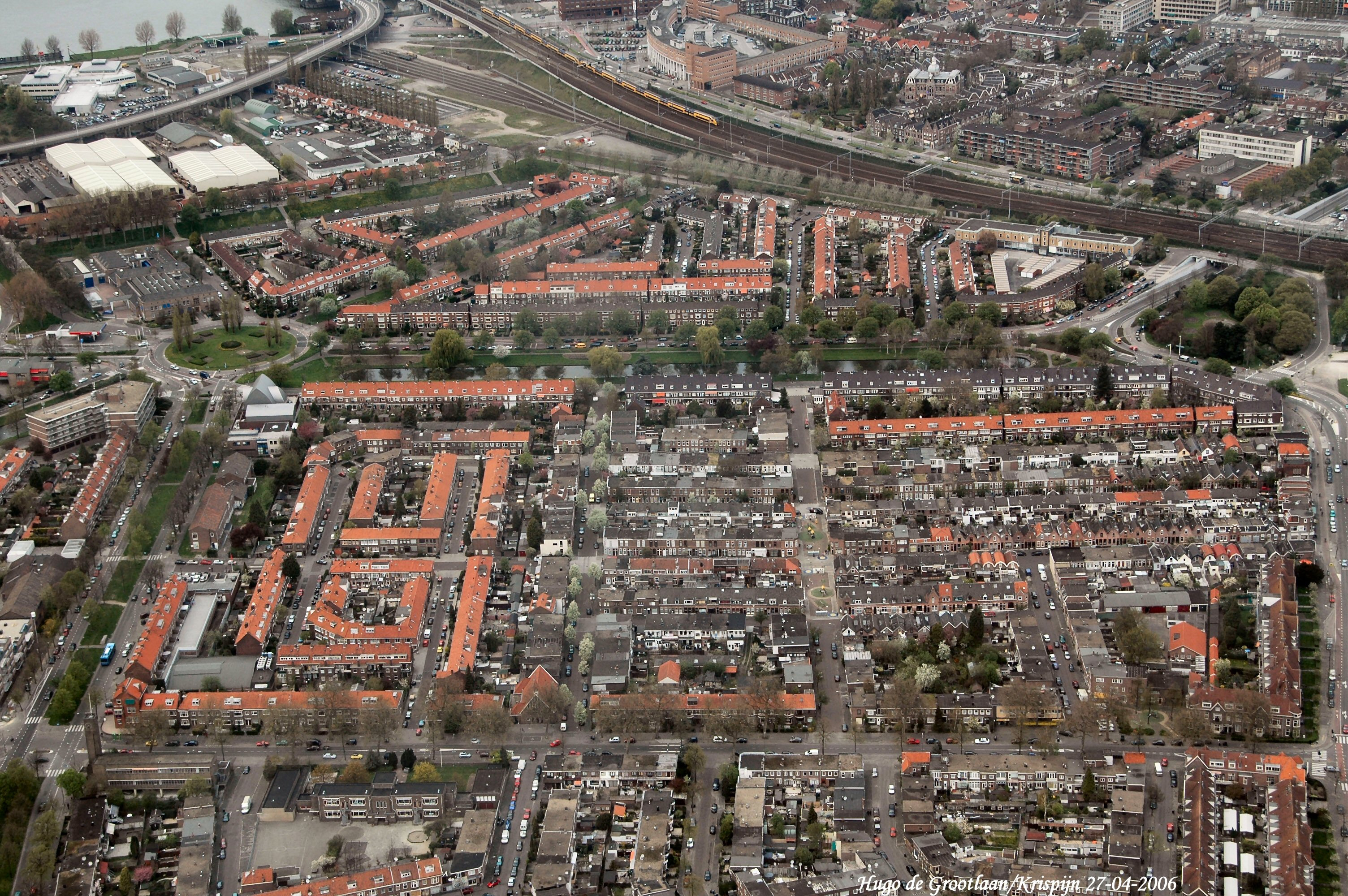 Links boven oprit Stadsbrug naar Zwijndrecht. Midden links Hugo de Grootplein. Links onder naar boven Brouwersdijk. Rechts onder naar boven Krispijnseweg. Onder van links naar rechts Bosboom Toussaintstraat.