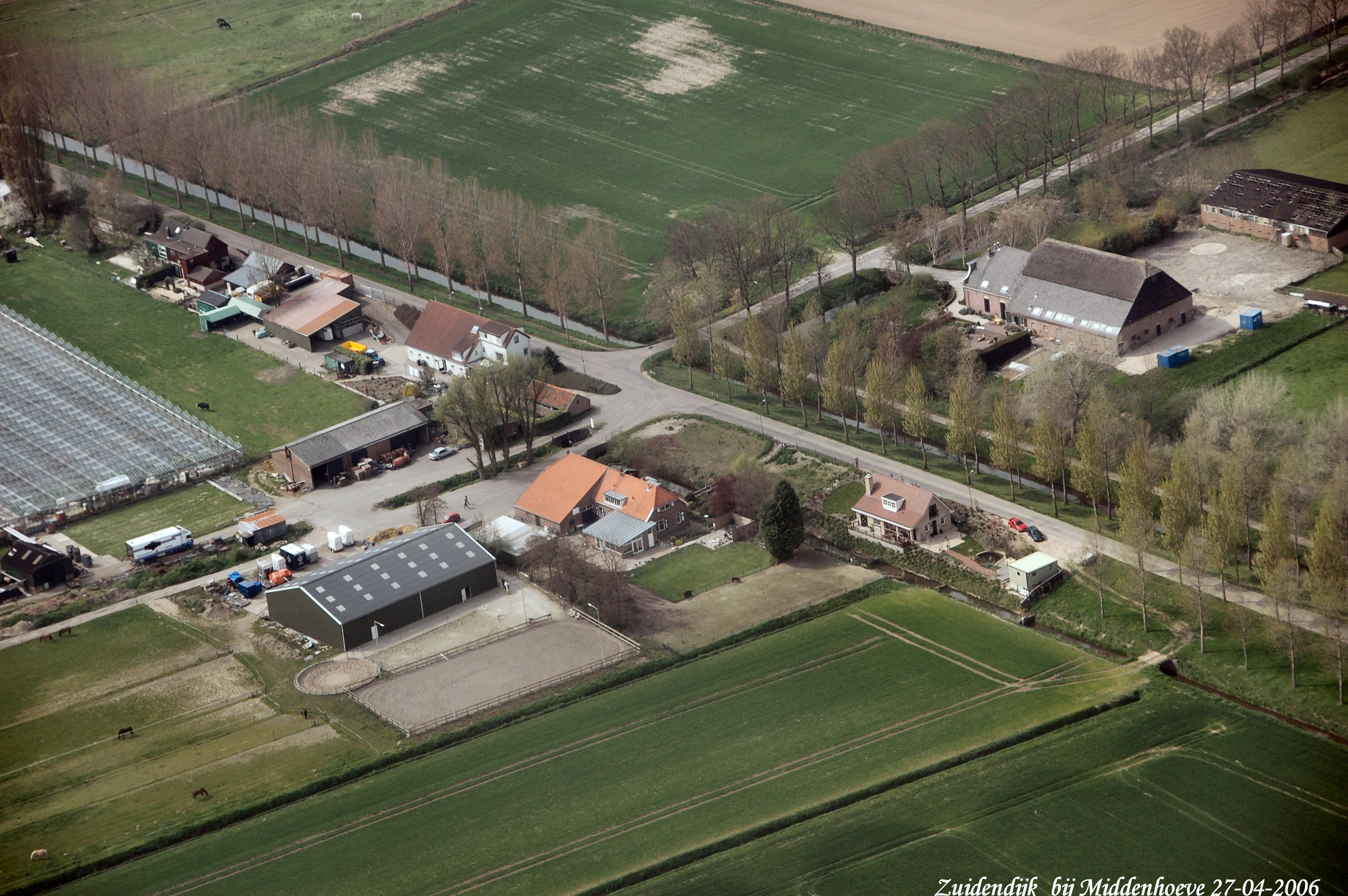 Zuidendijk met het Laantje van Middenhoeve rechts naar boven. Rechts boerderij Middenhoeve. gezien in Noord/Westelijke richting.