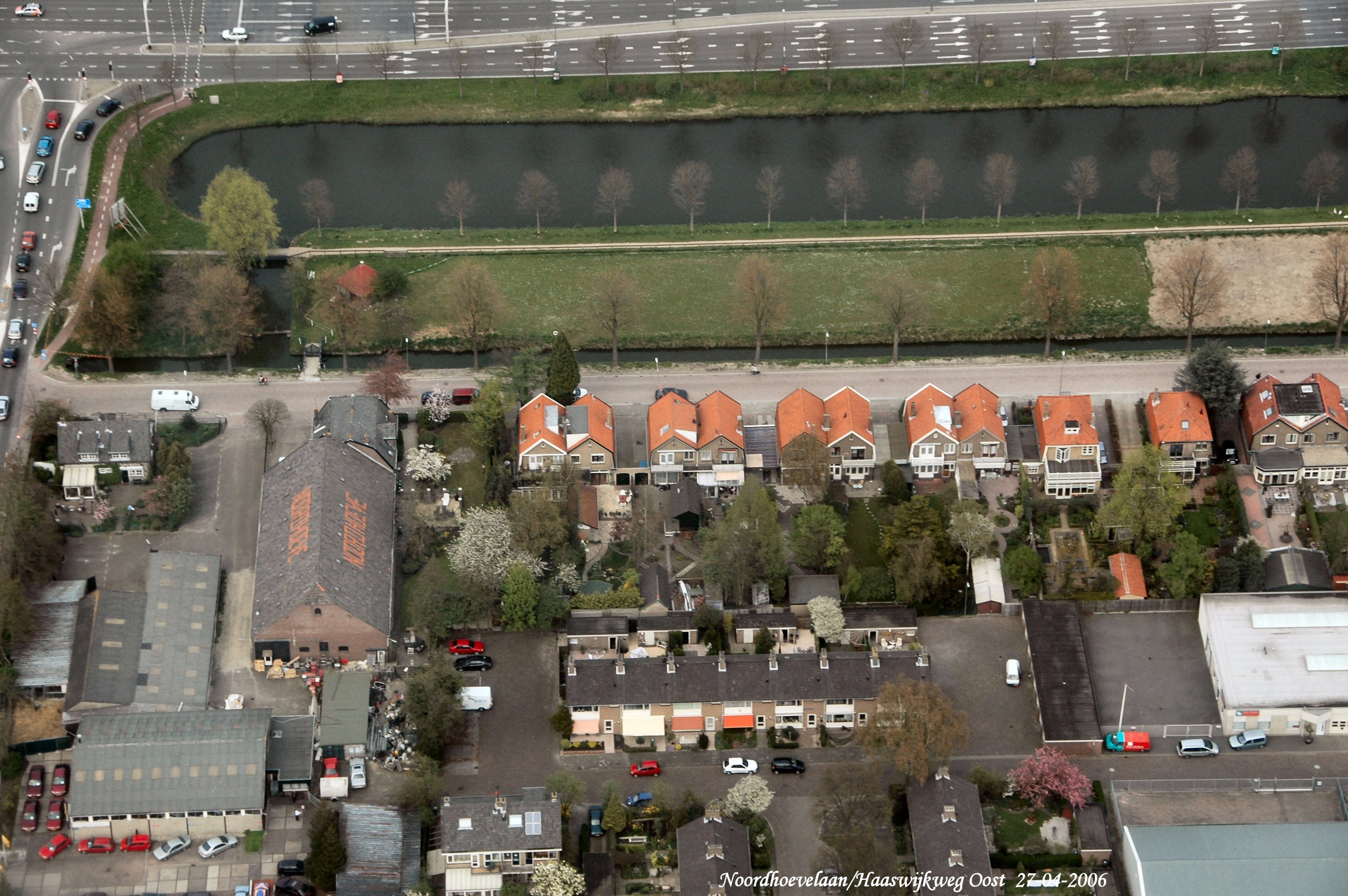 Boven is de Haaswijkweg West met de Ambachtstraat onder, links is de Noordhoevelaan, gezien in Noordelijke richting.