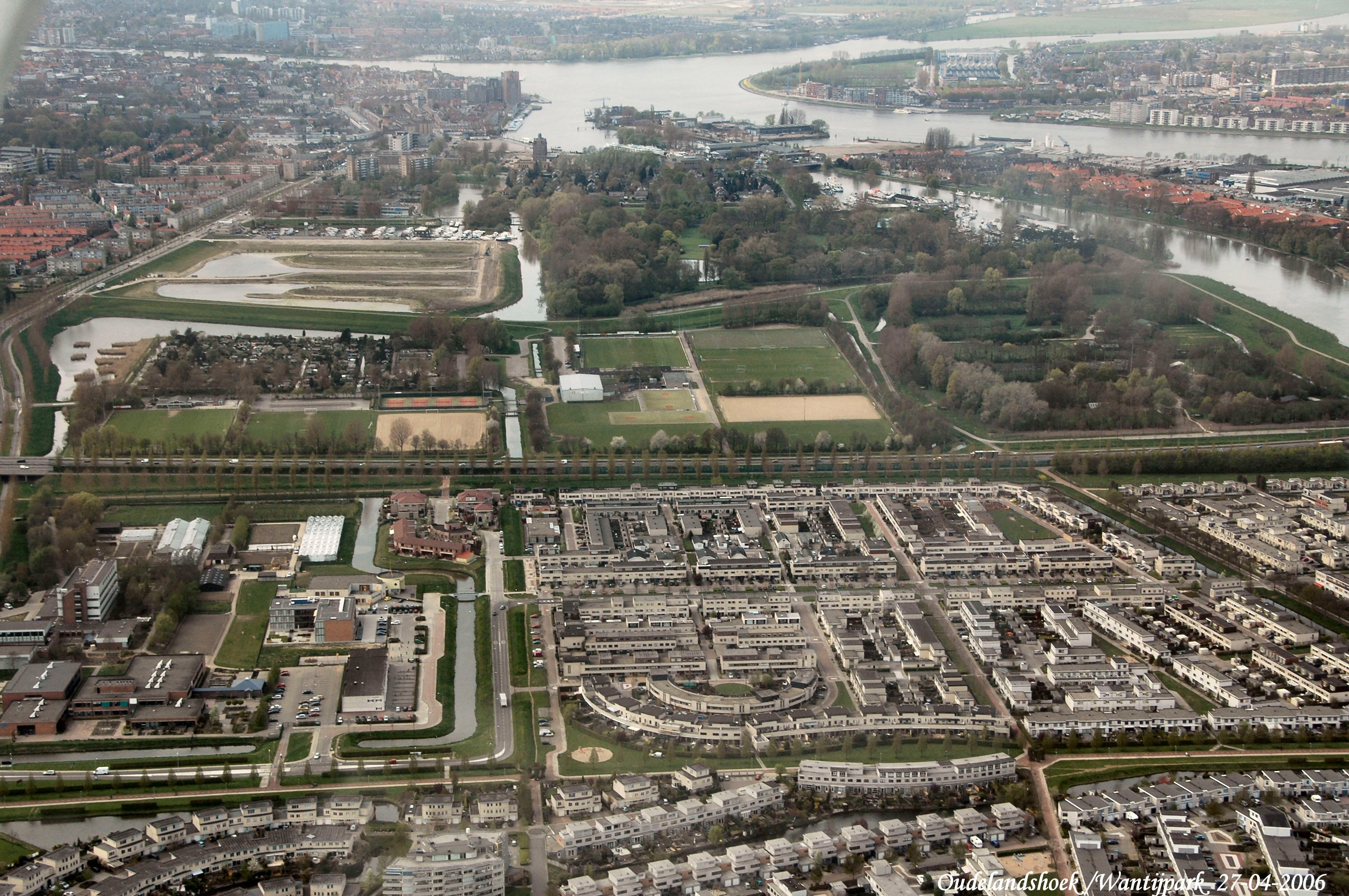 Midden van links naar rechts is de Rondweg N3. Midden rechts is Oudelandshoek. Boven rechts is het Wantijpark. Links boven is de Oude Maas. Rechts boven is het Wantij met de Staart en de Beneden Merwede met Papendrecht rechts boven. gezien in Noord/Westelijke richting.