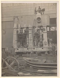 - Een bij Penn & Bauduin gebouwde motor voor het zeeschip Oranje voor een montagehal op de werf aan de 's-Gravendeelsedijk.