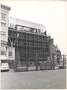 - De in verband met de restauratie in de steigers staande en van een bekapping voorziene Groothoofdspoort aan het Groothoofd. Het bovenste deel van de toren is gedemonteerd en wordt in de Nieuwkerk gerestaureerd. Links hotel Bellevue.
