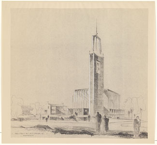 - Exterieurtekening van de Stephanuskerk aan de Talmaweg.