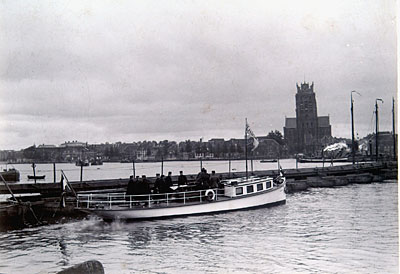 - Pontonniers hebben als oefening een schipbrug aangelegd over de rivier. Officieren inspecteren de brug vanaf het schip "Xerxes". Op de achtergrond Dordrecht met de Grote Kerk.