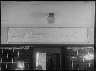 Gipsreliëf van kolentrein met stoomlocomotief in huize Verhoeven aan de Vriezeweg