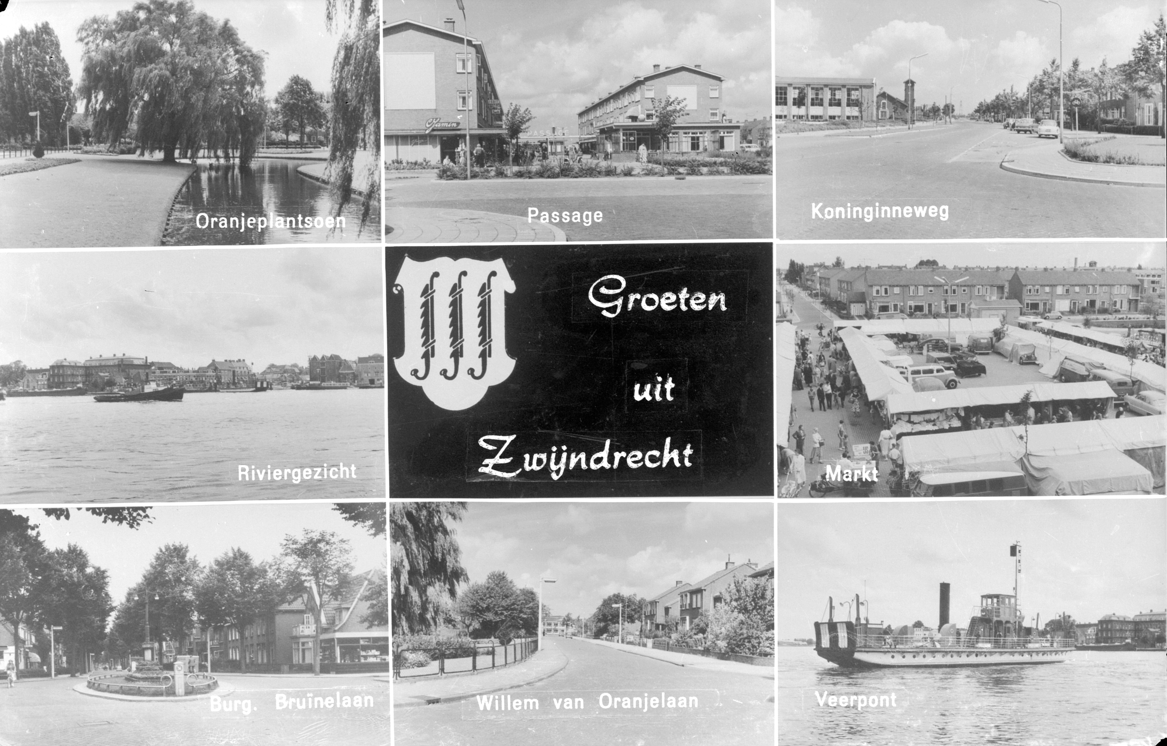 - Zwijndrecht, 'groeten uit...' prentkaart. Afbeelding van Oranjeplantsoen, riviergezicht, Burgemeester de Bruinelaan, Passage, Willem van Oranjelaan, Koninginneweg, markt, veerpont.