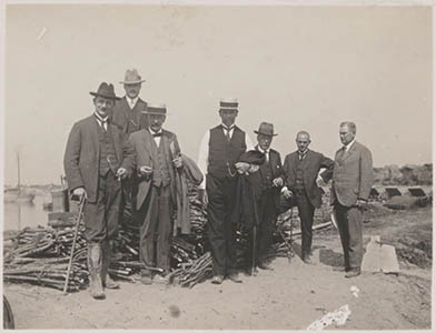 - Bezoek aan de inpolderingswerkzaamheden van de Hollandse Biesbosch. Van links naar rechts: 1 Ir. Verhoeven, 2..., 3 Ir. van Elzelingen, 4 Burgem. de Gaay Fortman, 5 Dr. Th. Stoop, 6 J.A.J. Jansen Manenschijn, 7 Dr. Arie Visser Papendrecht.