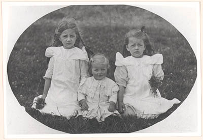 Drie zusjes Krins, op hun knieën in het gras van de Watermolenweide. V.l.n.r. Jozina …