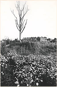 - Het terrein van de gesloopte gasfabriek aan de Merwekade. Op de voorgrond bloeiende kamillen en een dode boom; op de achtergrond de laatste huizen aan de oostkant van de Bleijenhoek en links het Papendrechtse veerhuis.