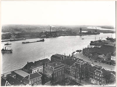 - Panorama vanaf de Grotekerkstoren naar het noorden gezien. Onder Maartensgat en Korte Engelenburgerkade, daarboven Blauwpoortsplein. en Oude Maas met links de veerpont; daarboven de Zwijndrechtse oever met centraal een glasoven en rechts boven de Noord.