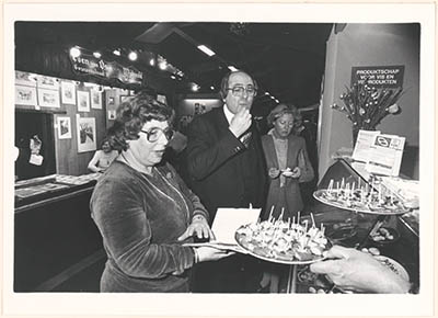 - Wethouder P.C. Janse proeft een hapje vis bij een stand van het Produktschap voor Vis en Visprodukten in de Ton Menkenhal (in 1990 Drechtstedenhal genoemd) aan de Karel Lotsyweg, waar een gezinsbeurs wordt gehouden.