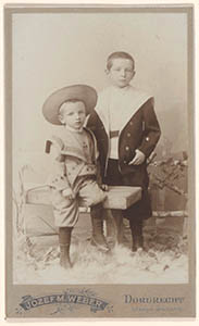 - Portret van twee onbekende jongetjes, ca. 5 en 7 jaar oud, staand en half zittend in een decor.