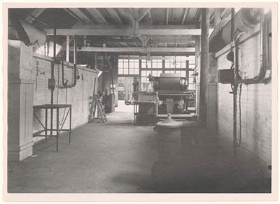 - Interieur van blikfabriek Thomassen & Drijver aan de Dubbeldamseweg Noord, hoek Oranjepark.