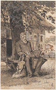 - Boekillustratie voor Ulbo Carvema van E. Scheidius gedrukt in 1893 bij drukkerij J.P. Revers. Voorstellend een man met twee kinderen op een bank rond een boom