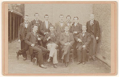 - Leden van rederijkerskamer Inter Amicos op een binnenplaats.1e van links staand is barbier Hendrikus Johannes Tijssen (Dordrecht 8 november 1873/1928).