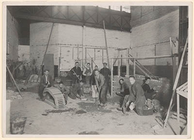 - Leerlingen (werkelozenonderwijs) van de afdeling metselen van de Centrale Werkplaats in de voormalige Lips-fabriek aan de Spuiweg, hoek Burgemeester de Raadtsingel.