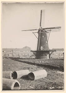 - De stellingkorenmolen Willem II (gebouwd 1841, gesloopt mei 1934) aan de zuidzijde van de Krommedijk ter hoogte van de Vorensaterstraat; op de voorgrond rioolbuizen, op de achtergrond het omstreeks 1930 verrezen Land van Valk.