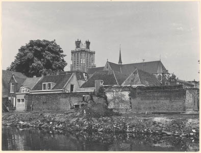 - Sloopwerkzaamheden aan de Boogjes; een deel van de oude stadsmuur staat nog overeind. Op de achtergrond de Grote Kerk.