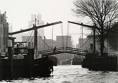 - Wolwevershaven met de Damiatebrug richting het Vlak en de Grote Kerk. Links de Kuipershaven.