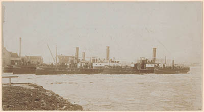 - Vijf stoomboten voor het personenvervoer van rederij Fop Smit in de haven van IJsselmonde tijdens de winter van 1904; de Oude Maas is met ijsschotsen bedekt.