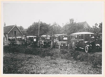 - Zes bussen van Lijn 3 van het busbedrijf van dhr. Dirkzwager uit 's-Gravendeel, die in de jaren twintig het openbaar vervoer in de Hoeksche Waard exploiteerde; waarschijnlijk in 's-Gravendeel; de chauffeurs staan naast hun bussen; in 1933 nam Dirkzwager de aandelen van de EDAD over.