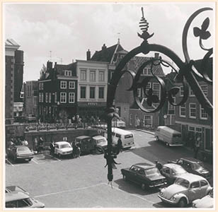 - Het Stadhuisplein gezien van de Groenmarkt naar de Lombardbrug en de hoek Voorstraat / Lombardstraat (links). Op de voorgrond een ijzeren gevelversiering.