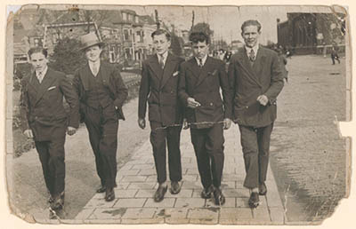 - Een vijftal jongelui op de Burgemeester de Raadtsingel. V.l.n.r. T. aan de Wiel, Jacobus Wegman, B. de Boer, N. aan de Wiel, M. Krüg. Rechts de locomotievenloods van de NS.